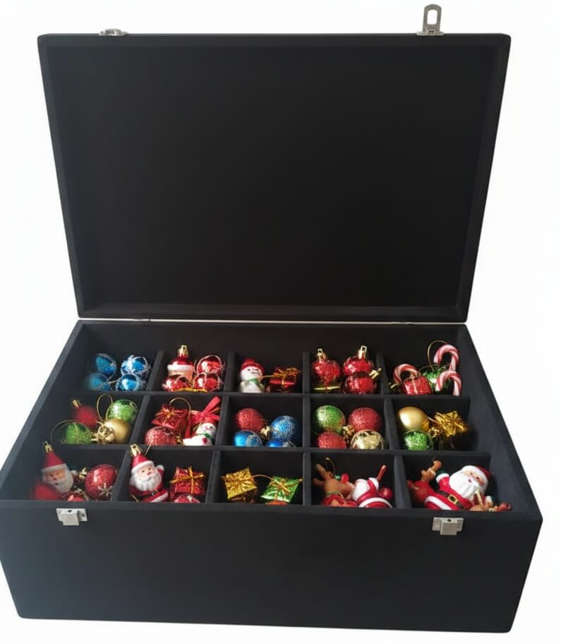 We used plywood, mdf and velvet fabric to make those compartments. And now they look in perfect shape and size ready to store any christmas ornament in the box safely.